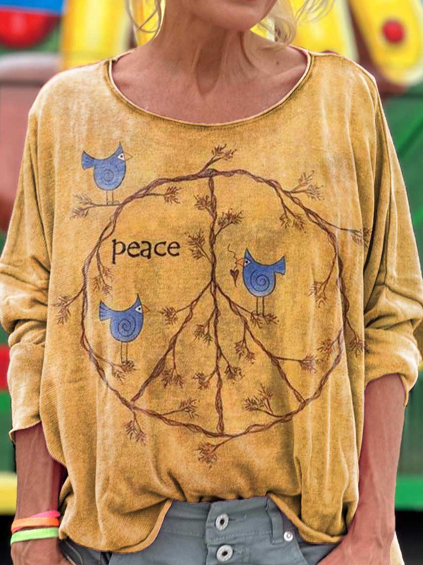 Retro Hippie Peace Sign Love and Peace Art Print Casual Long Sleeve T-shirt