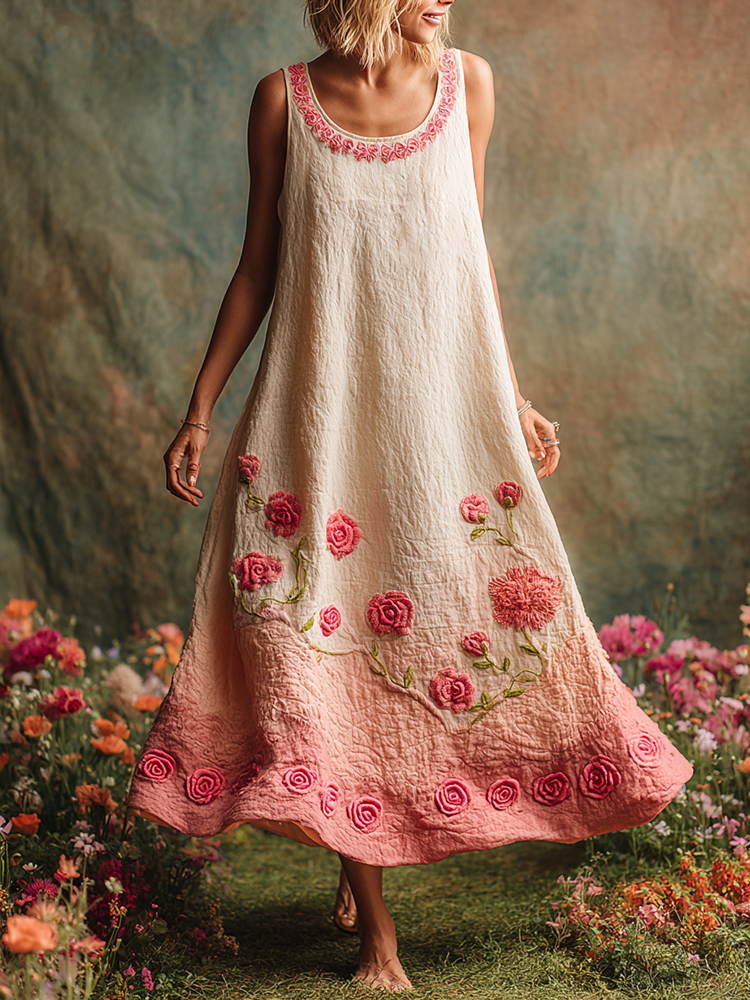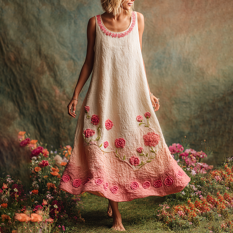 Pink Floral Embroidered Gradient Linen Tank Maxi Dress