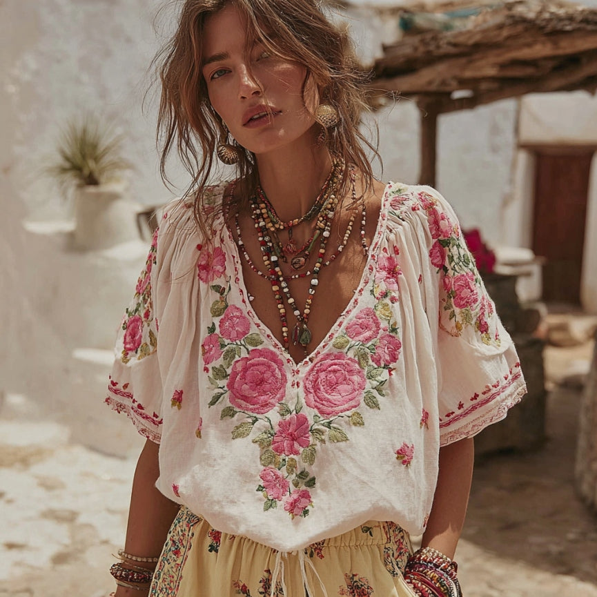 Women's Pink Rose Embroidered V-neck Linen Blend T-shirt