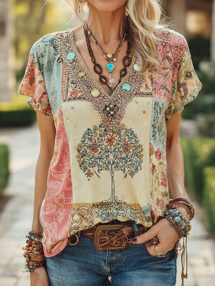 Women's Tree Of Life Patchwork Breast Cancer Ribbon T-shirt