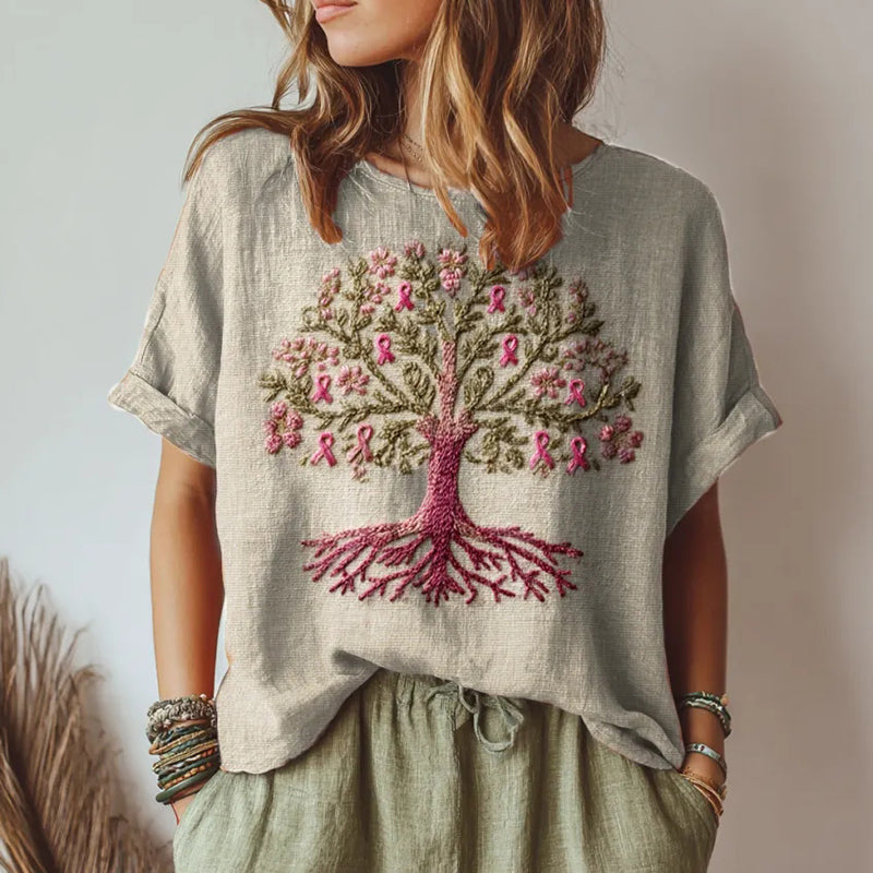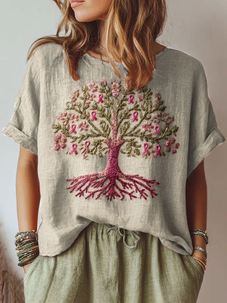 Women's Tree Of Life Pink Ribbon Embroidery Round Neck Half Sleeve T-shirt