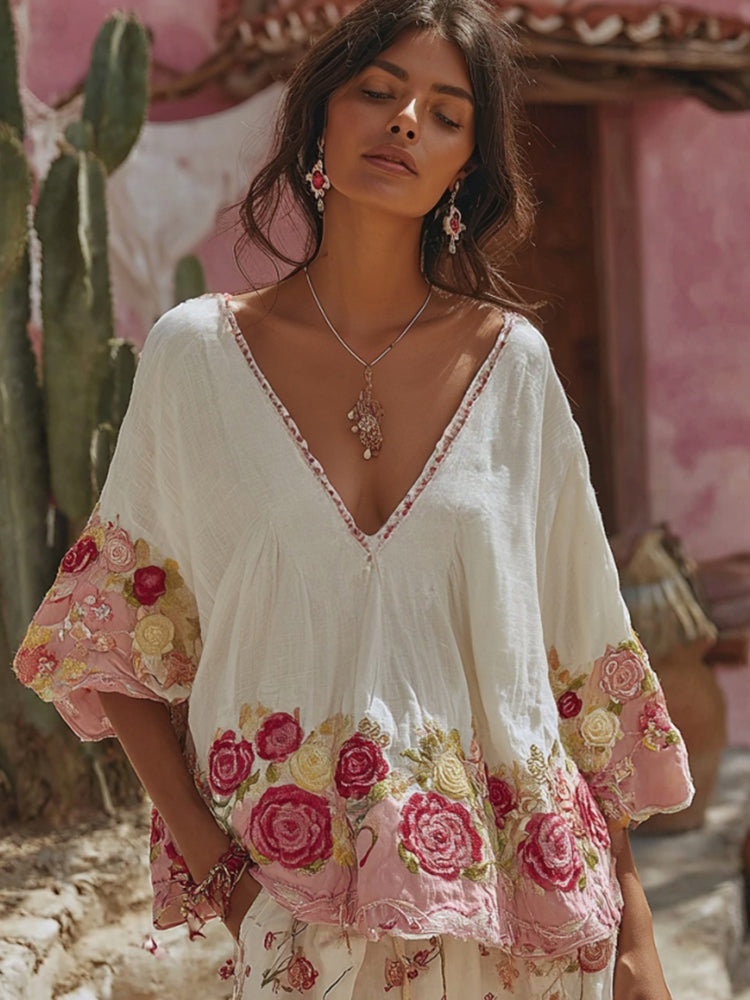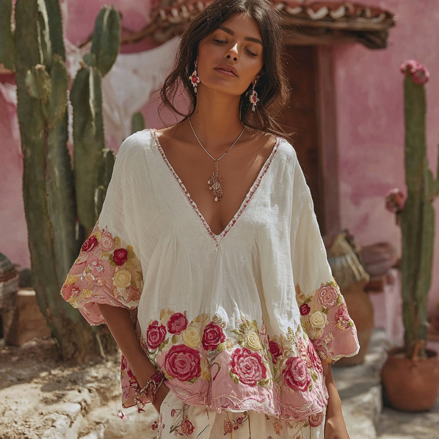 Women's Vintage Floral Art Embroidery Linen T-shirt