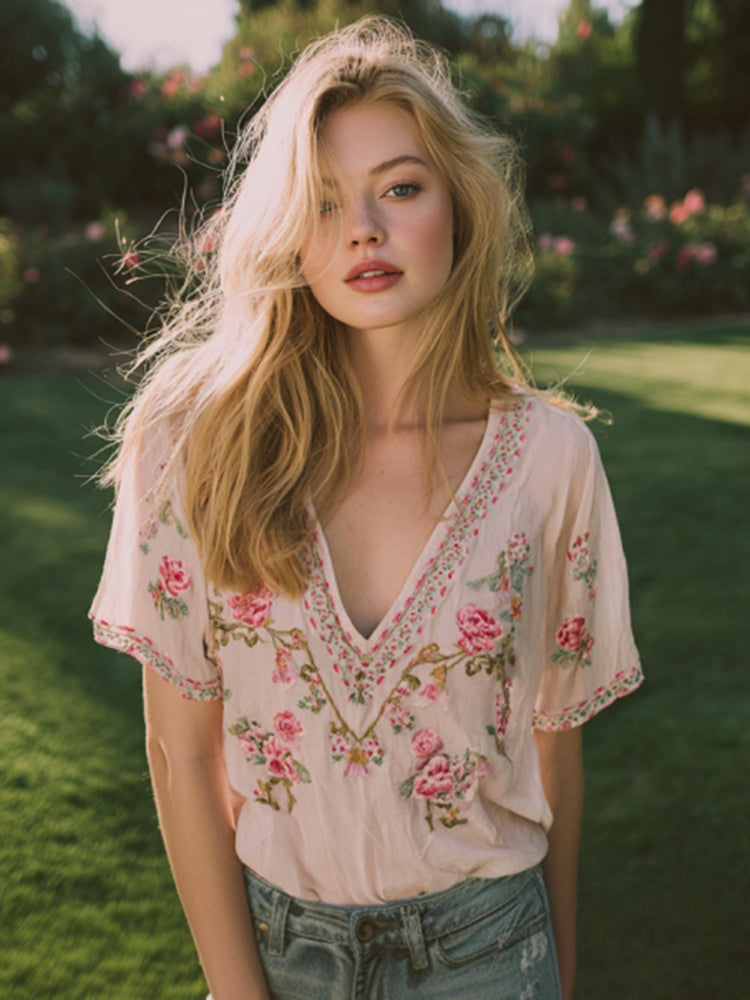 Women's Vintage Floral Embroidery Art Linen T-shirt