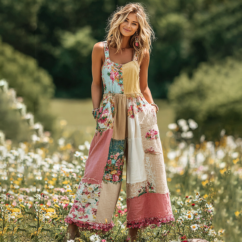 Women's Vintage Floral Patch Art Print Comfy Jumpsuit