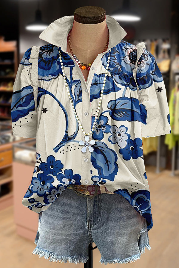 Retro Floral Print Short Sleeve Collared Short Sleeve Top