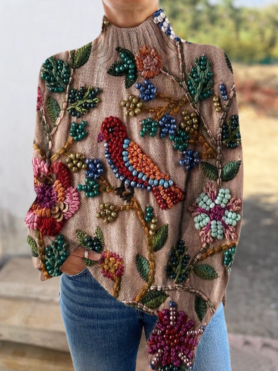 Retro Flowers & Birds Print Knit Turtleneck Pullover Sweater