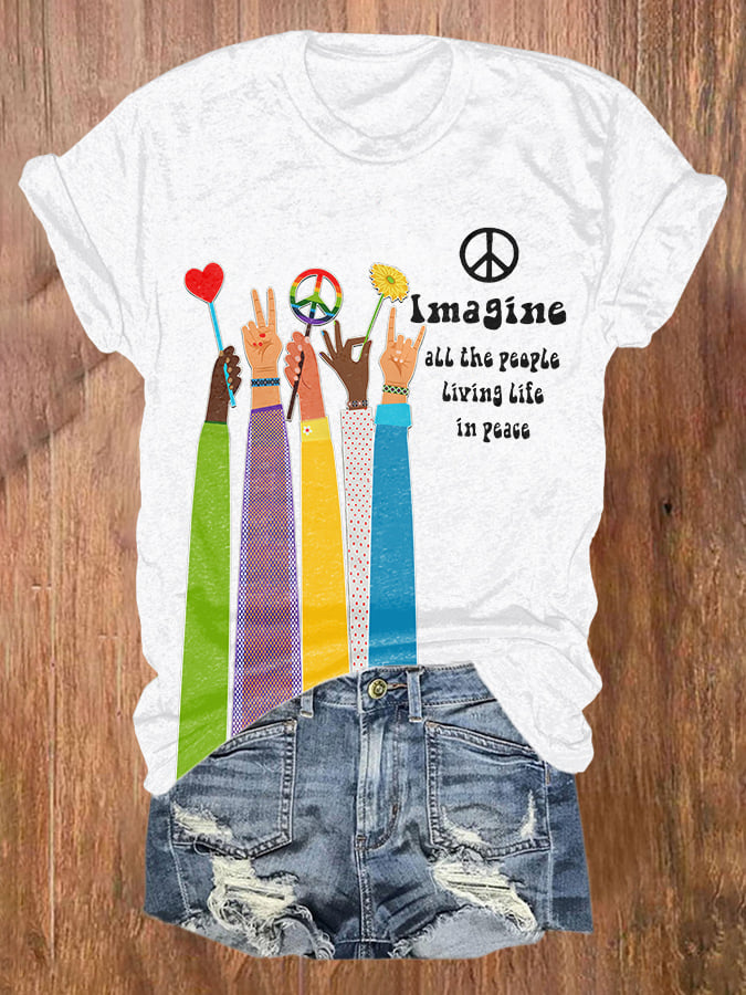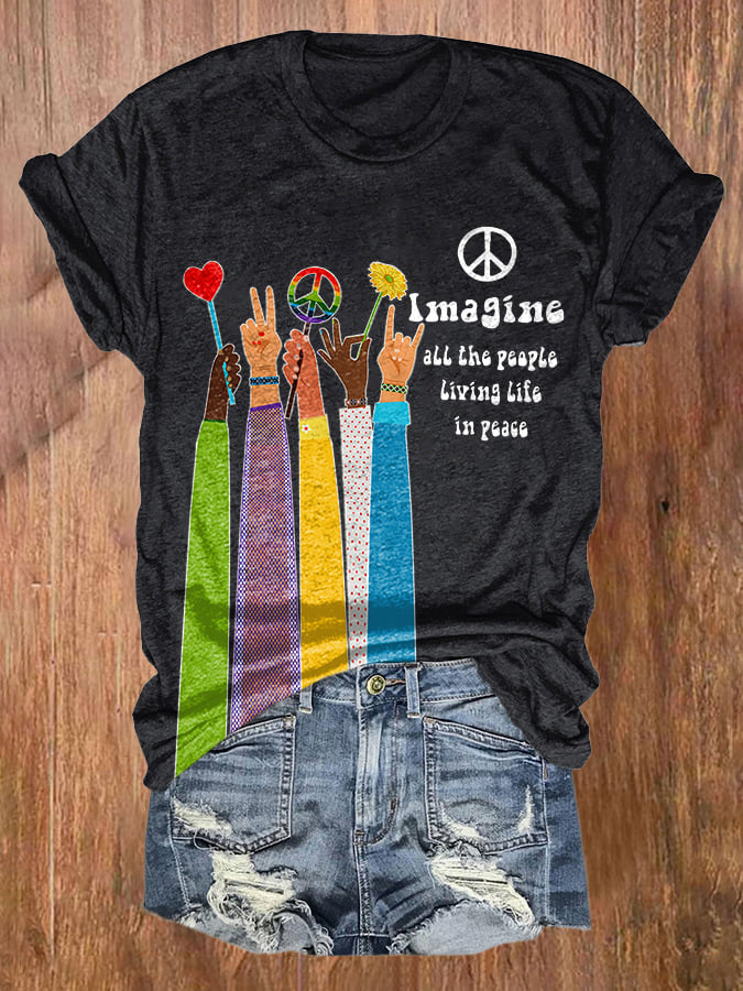 Retro Hippie Imagine All The People Living Life In Peace Print T-Shirt