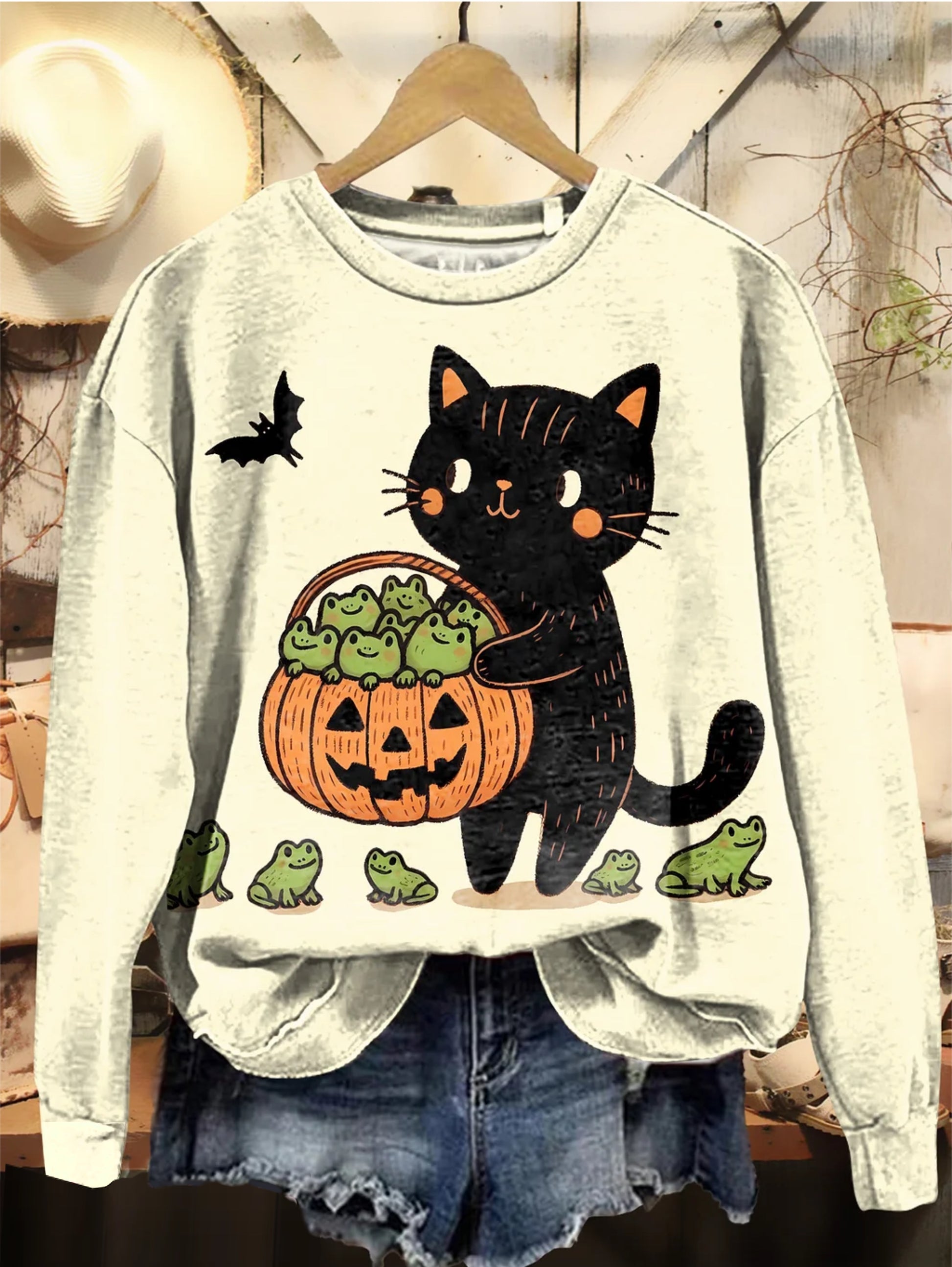 Vintage Halloween Pumpkins Frog Black Cat Art Print Sweatshirt