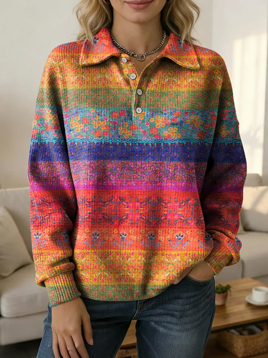 Vintage National Flower Stripes Women's Print Casual Cotton Shirt