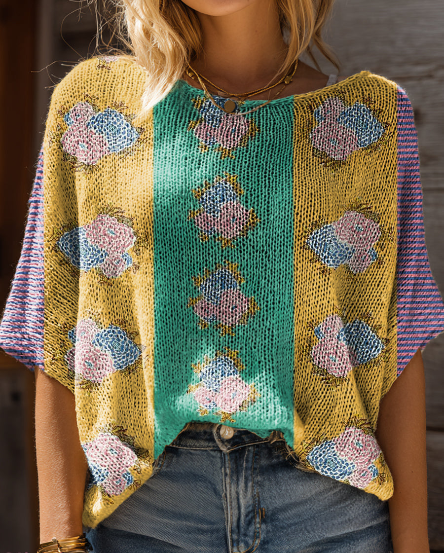 Women's Bohemian Floral Art Print Casual Short Sleeves Pullover Sweater