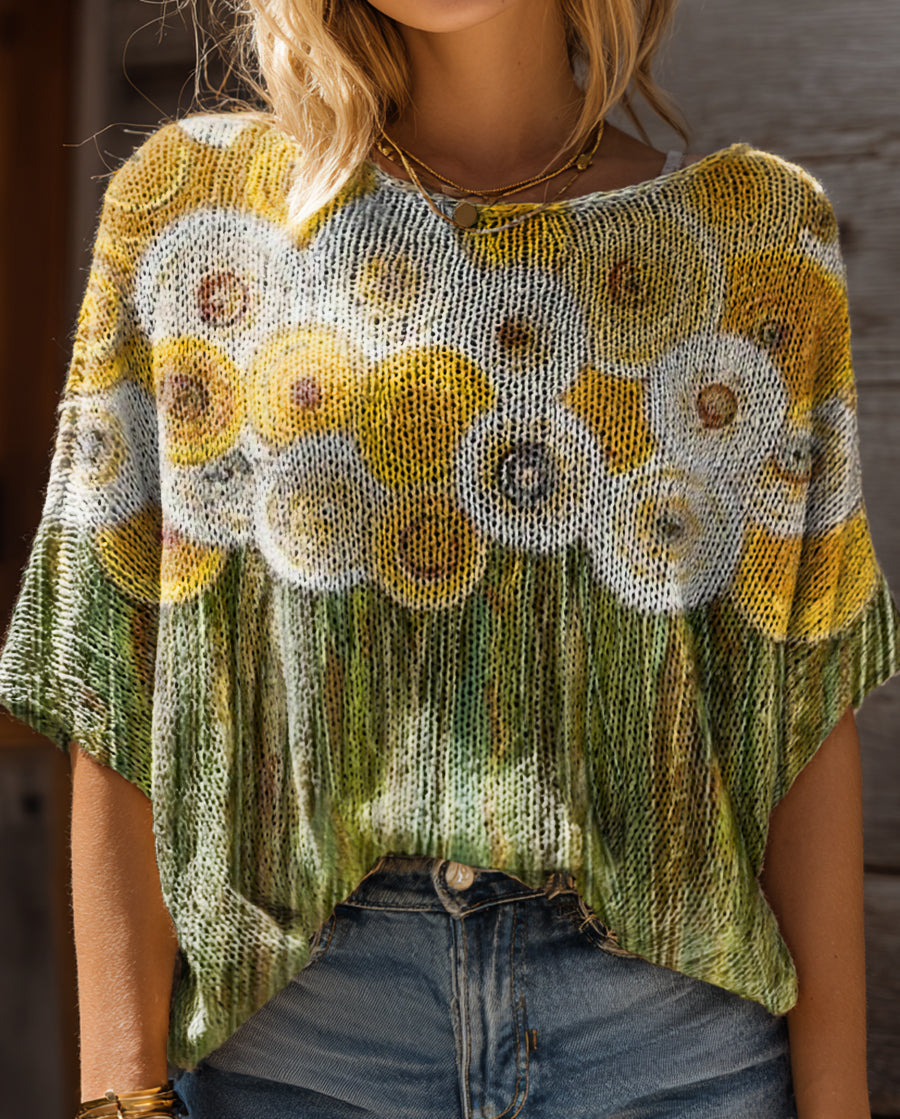 Women's Bohemian Floral Art Print Casual Short Sleeves Pullover Sweater