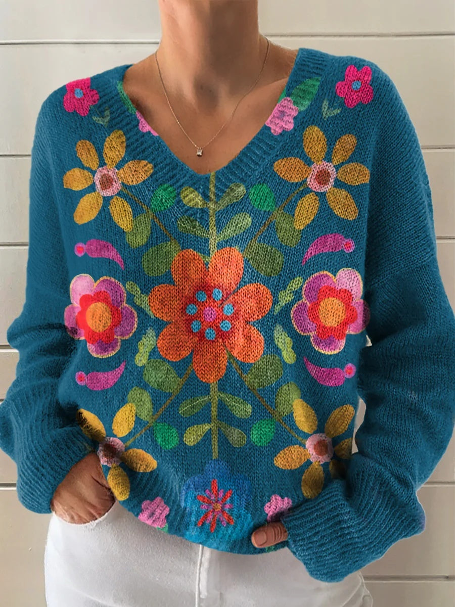 Women's Bohemian Floral Art Print Casual V-Neck Knitted Sweater