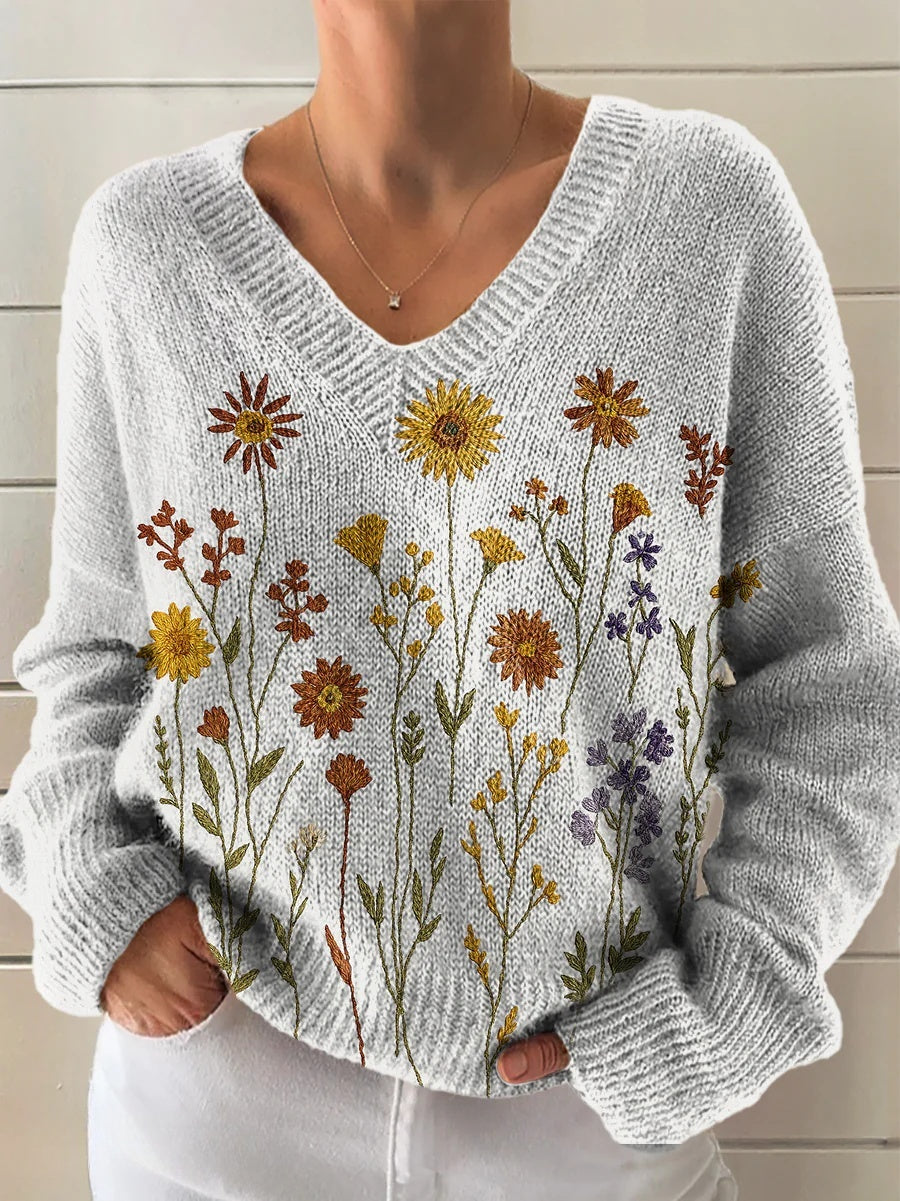 Women's Bohemian Floral Art Print Casual V-neck Pullover Knit