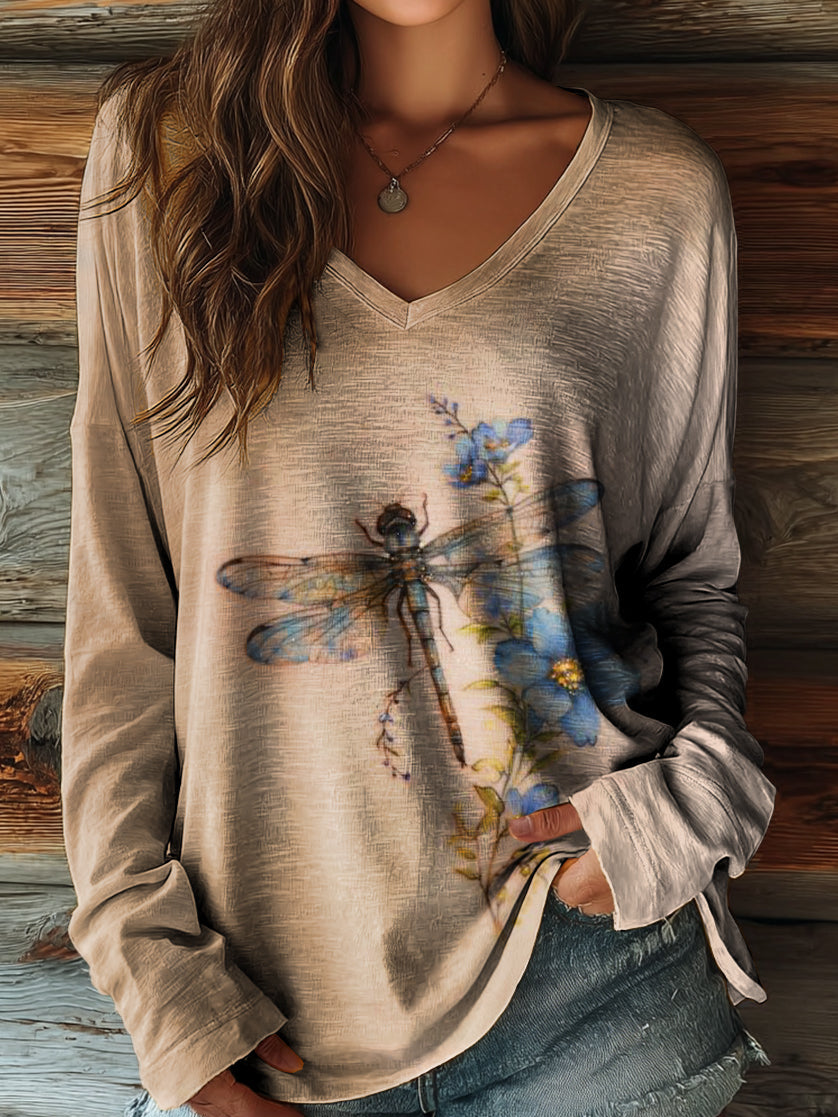 Women's Bohemian Floral Dragonfly Art Print Casual V-neck Long Sleeve T-shirt