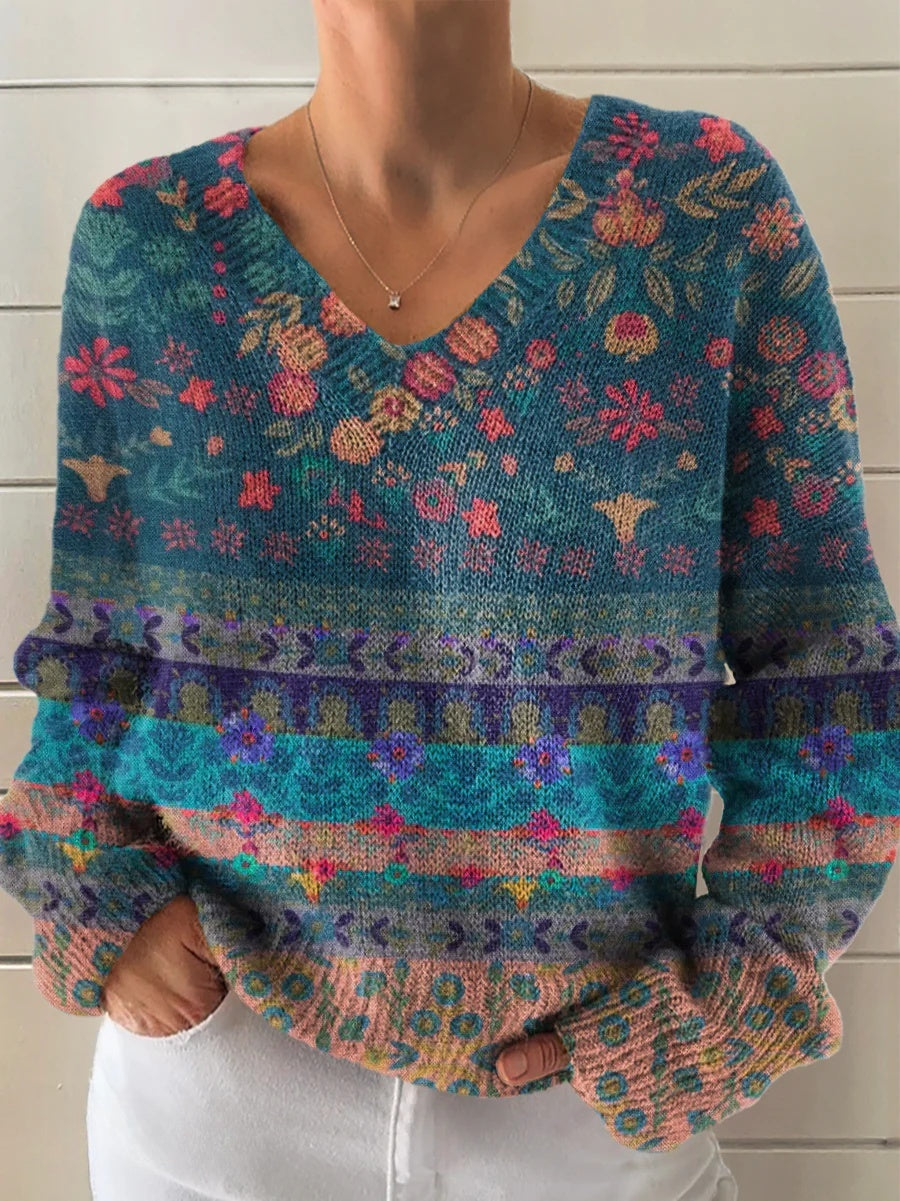 Women's Boho Floral Collage Art Pattern Print Casual V-Neck Knitted Sweater