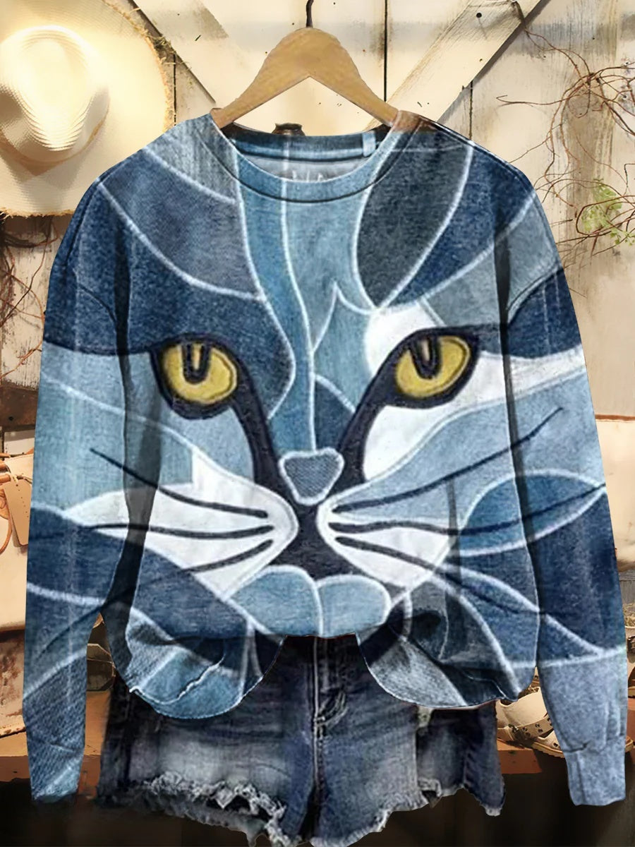 Women's Cat Patchwork Pattern Printed Round Neck Long Sleeve Sweatshirt
