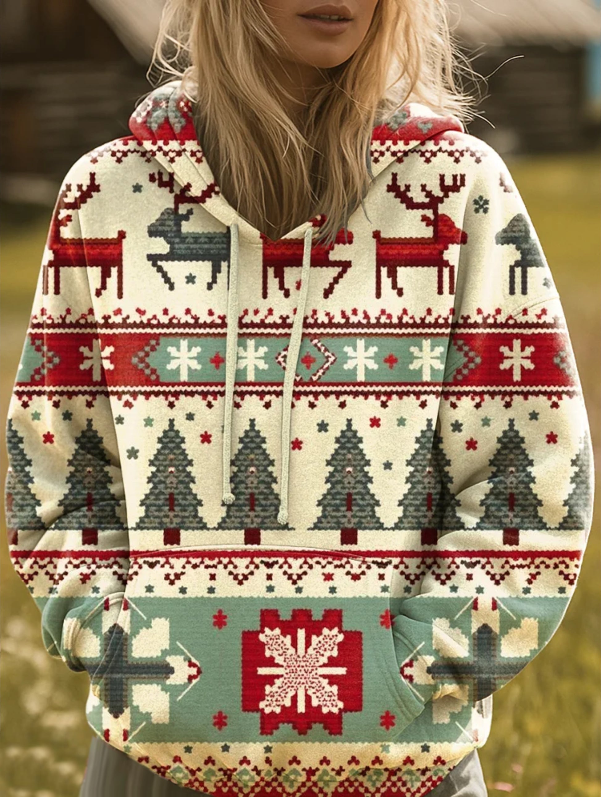 Women's Christmas Tree Snowflake Reindeer Patchwork Art Print Casual Hooded Pocket Drawstring Sweatshirt