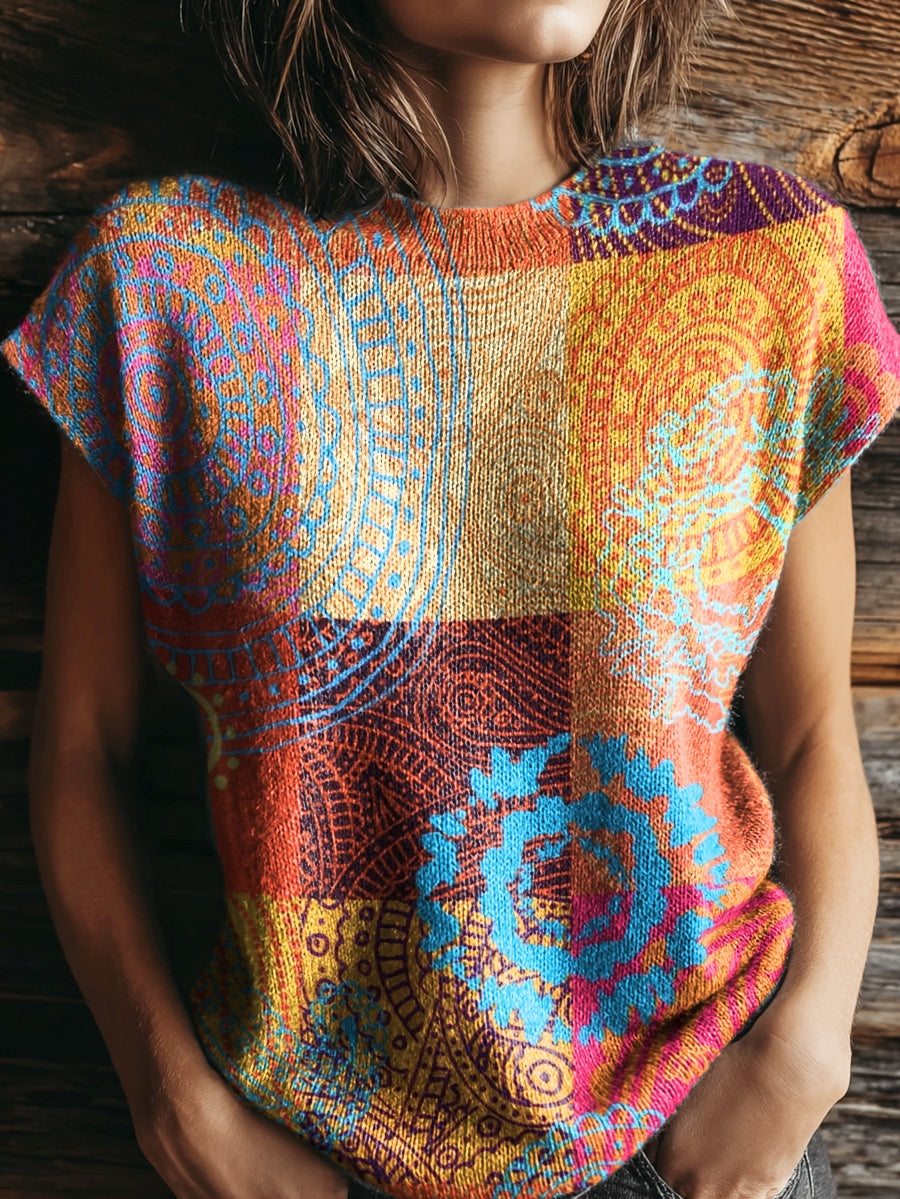 Women's Colorful Ethnic Totems Print Casual Crew Neck Short Sleeve Knitted Sweater