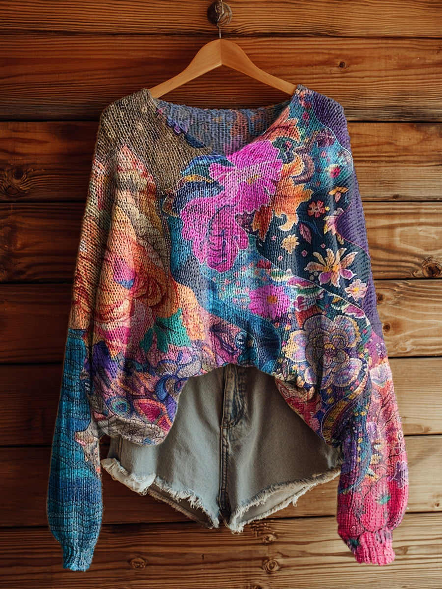 Women's Colorful Folk Floral Art Pattern Print Casual V Neck Pullover Sweater