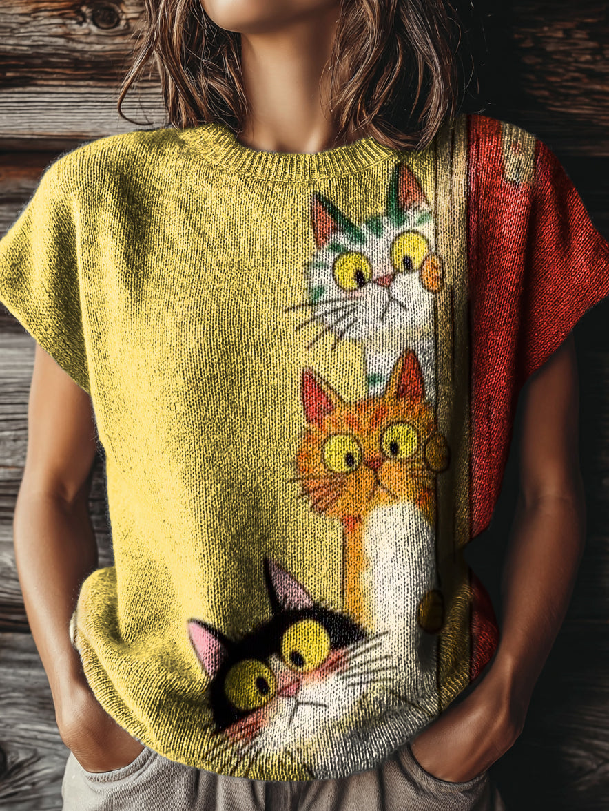 Women's Cute Cat Art Print Casual Crew Neck Short Sleeve Knitted Sweater