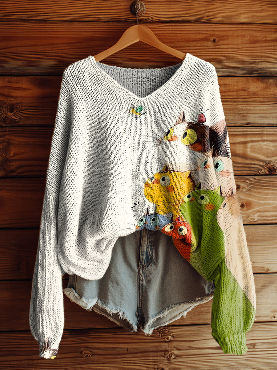 Women's Cute Cat Art Print Casual Pullover Sweater