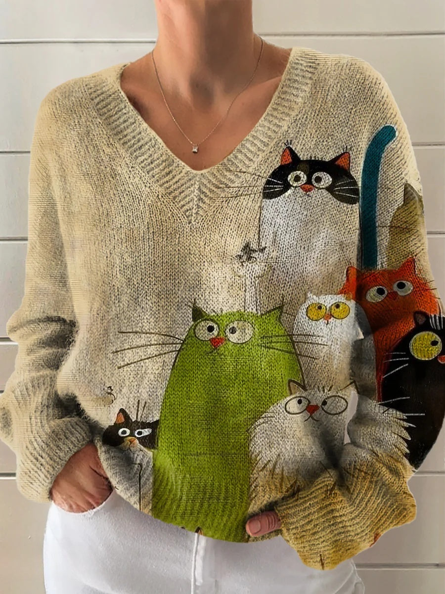 Women's Cute Cat Art Print Casual V-neck Pullover Knit