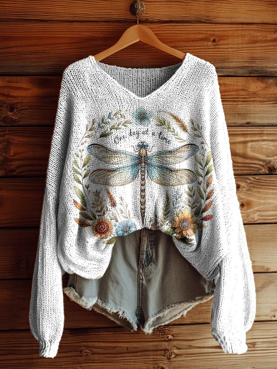 Women's Dragonfly Floral Art Print Casual Pullover Sweater