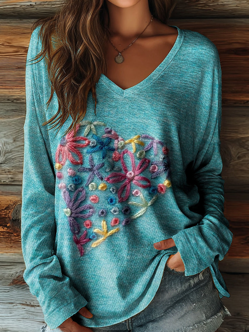 Women's Ethnic Collage Heart Floral Art Pattern Print Casual V-neck Long Sleeve T-shirt