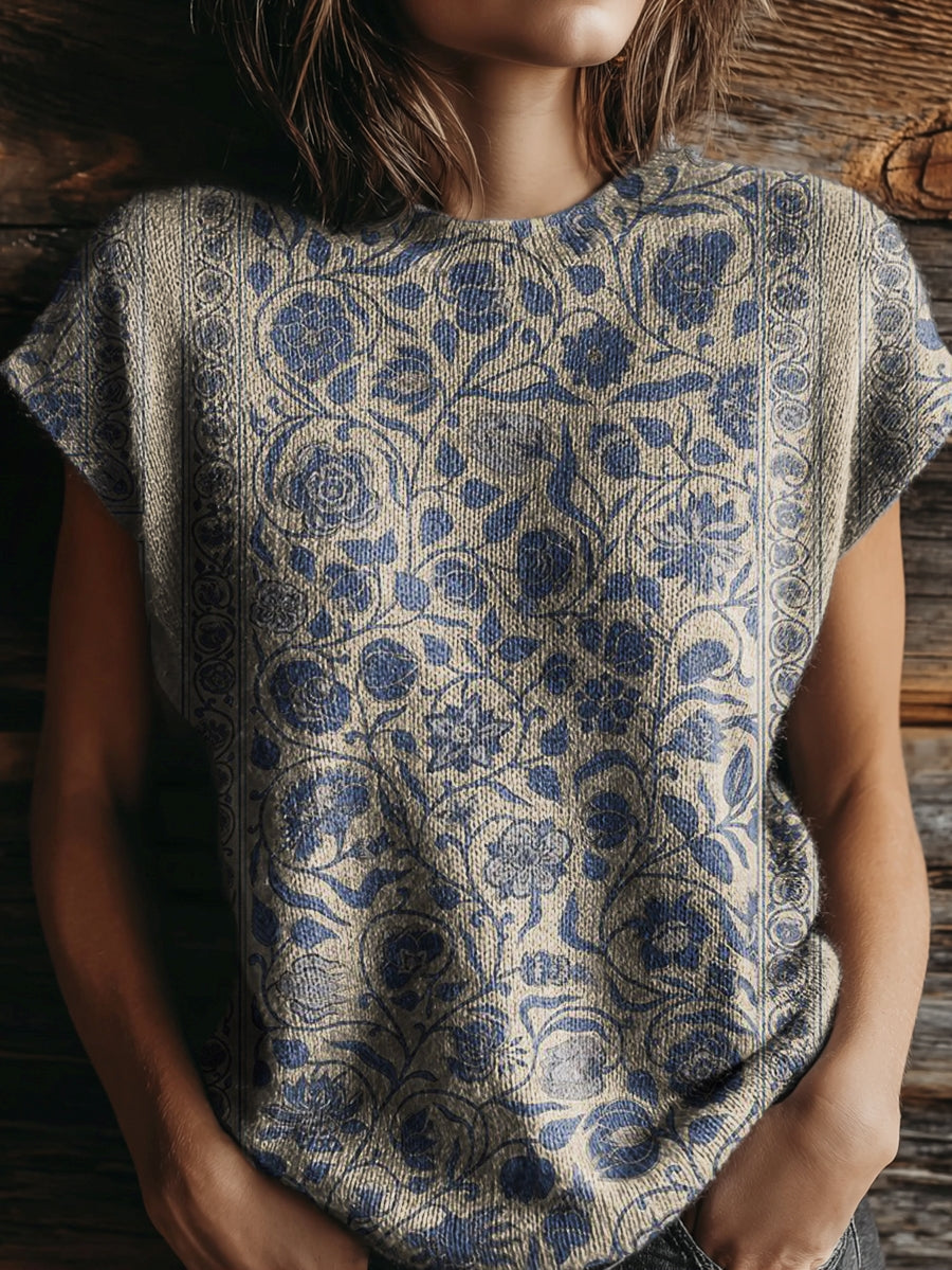 Women's Floral Tattoo Pattern Art Print Casual Crew Neck Short Sleeve Knit Sweater