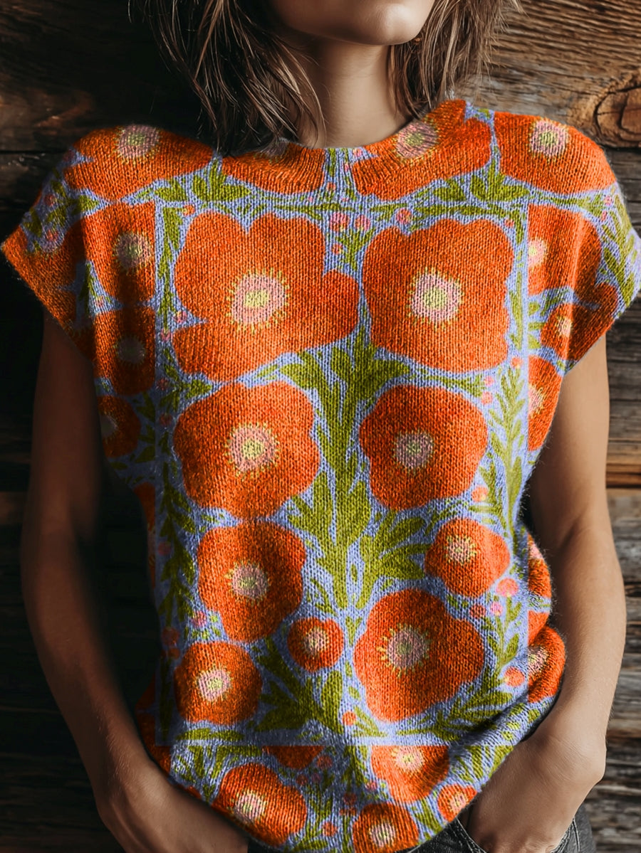 Women's Floral Tattoo Pattern Art Print Casual Crew Neck Short Sleeve Knit Sweater