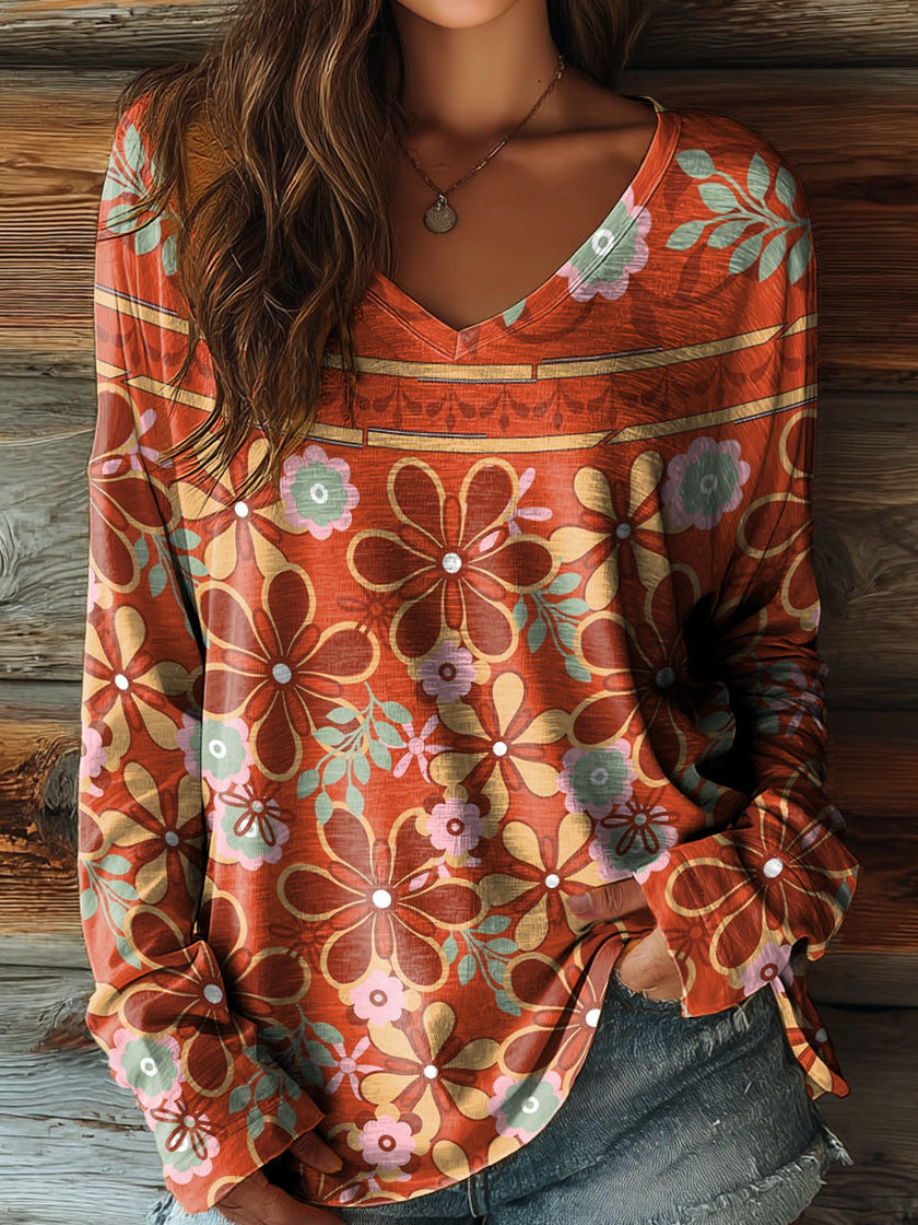 Women's Hippie Flower Power Art Pattern Print Casual V-neck Long Sleeve T-shirt