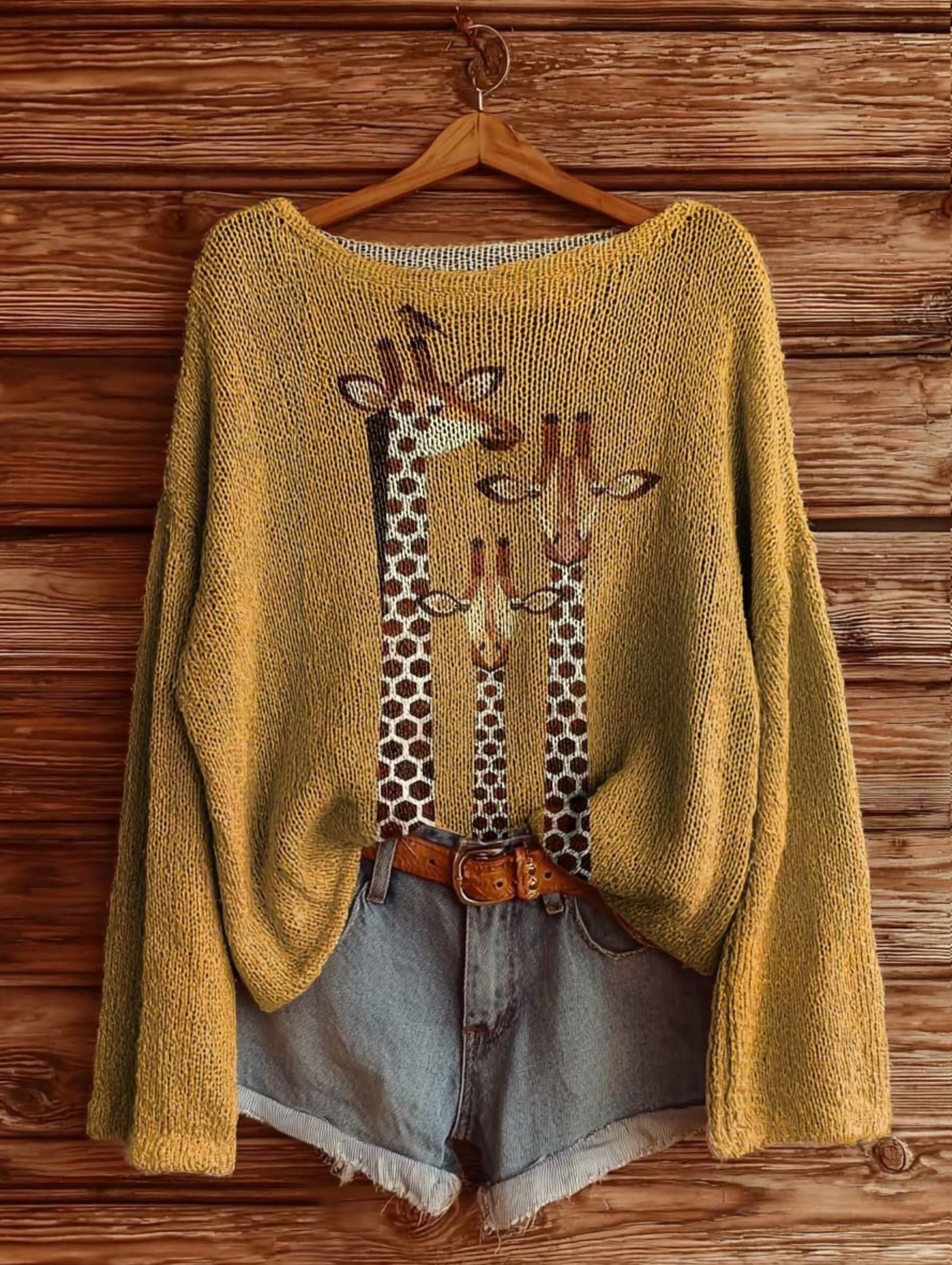Women's Long-Sleeved Artistic Print Knitted Sweatshirt with Giraffe Pattern