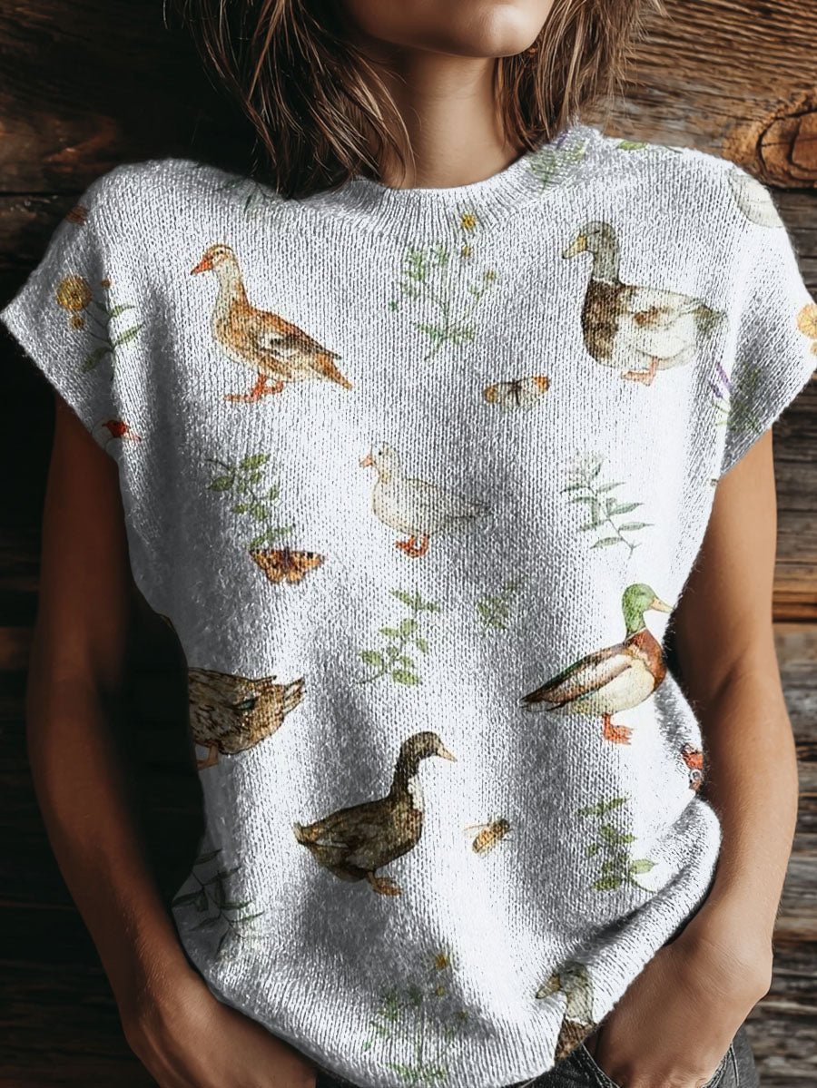 Women's Natural Native Duck Art Print Casual Crew Neck Short Sleeve Knitted Sweater