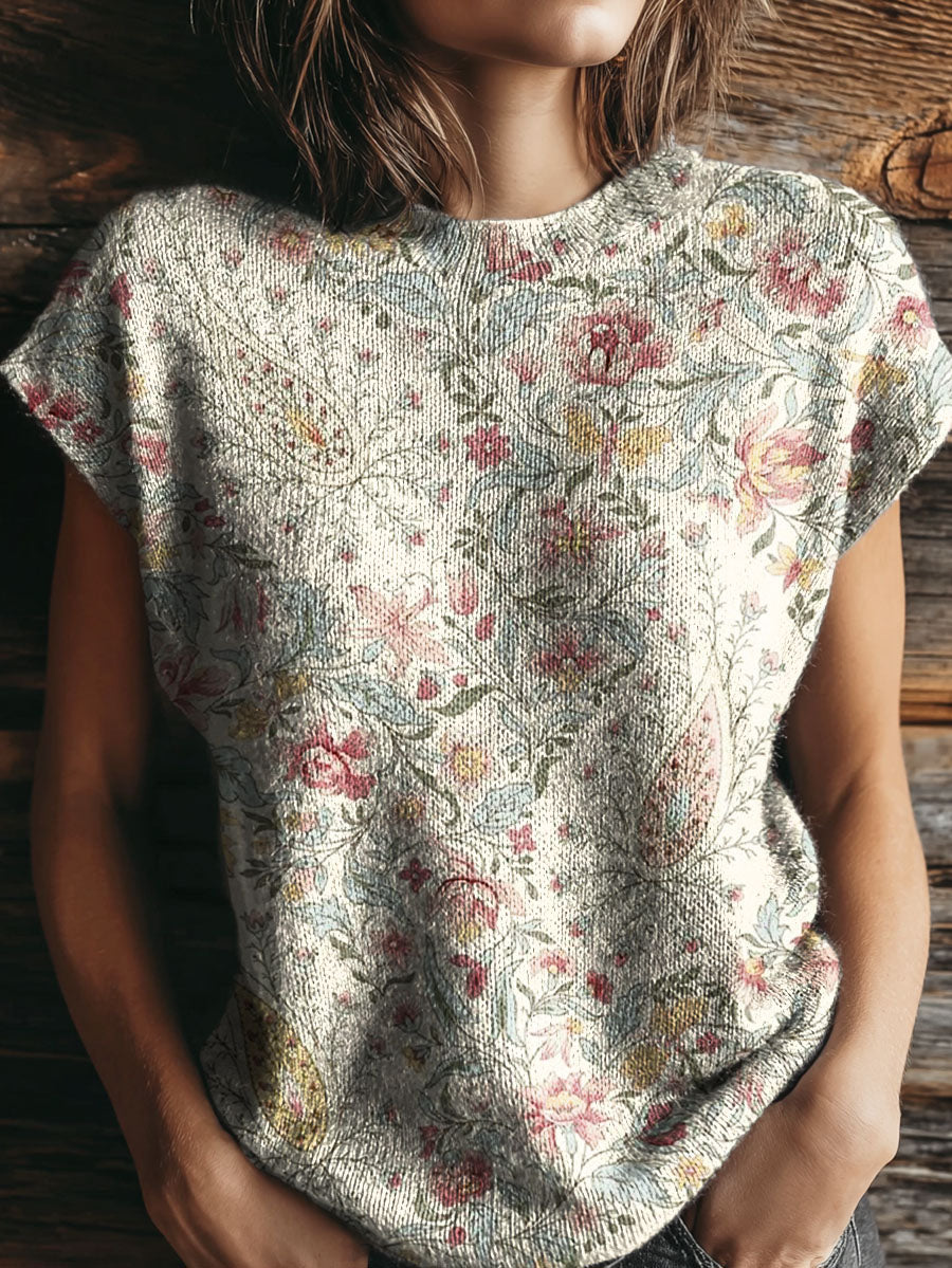 Women's Paisley National Flowers Art Print Casual Crew Neck Short Sleeve Knitted Sweater