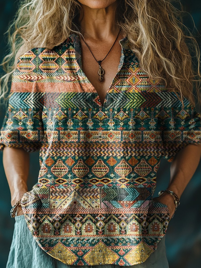 Women's Retro Colorful Plaid Print Casual Linen V-neck Shirt