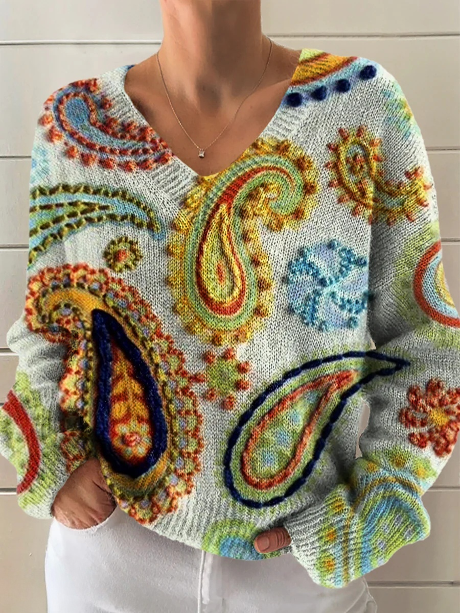 Women's Retro Paisley Floral Art Print Casual V-neck Pullover Knit