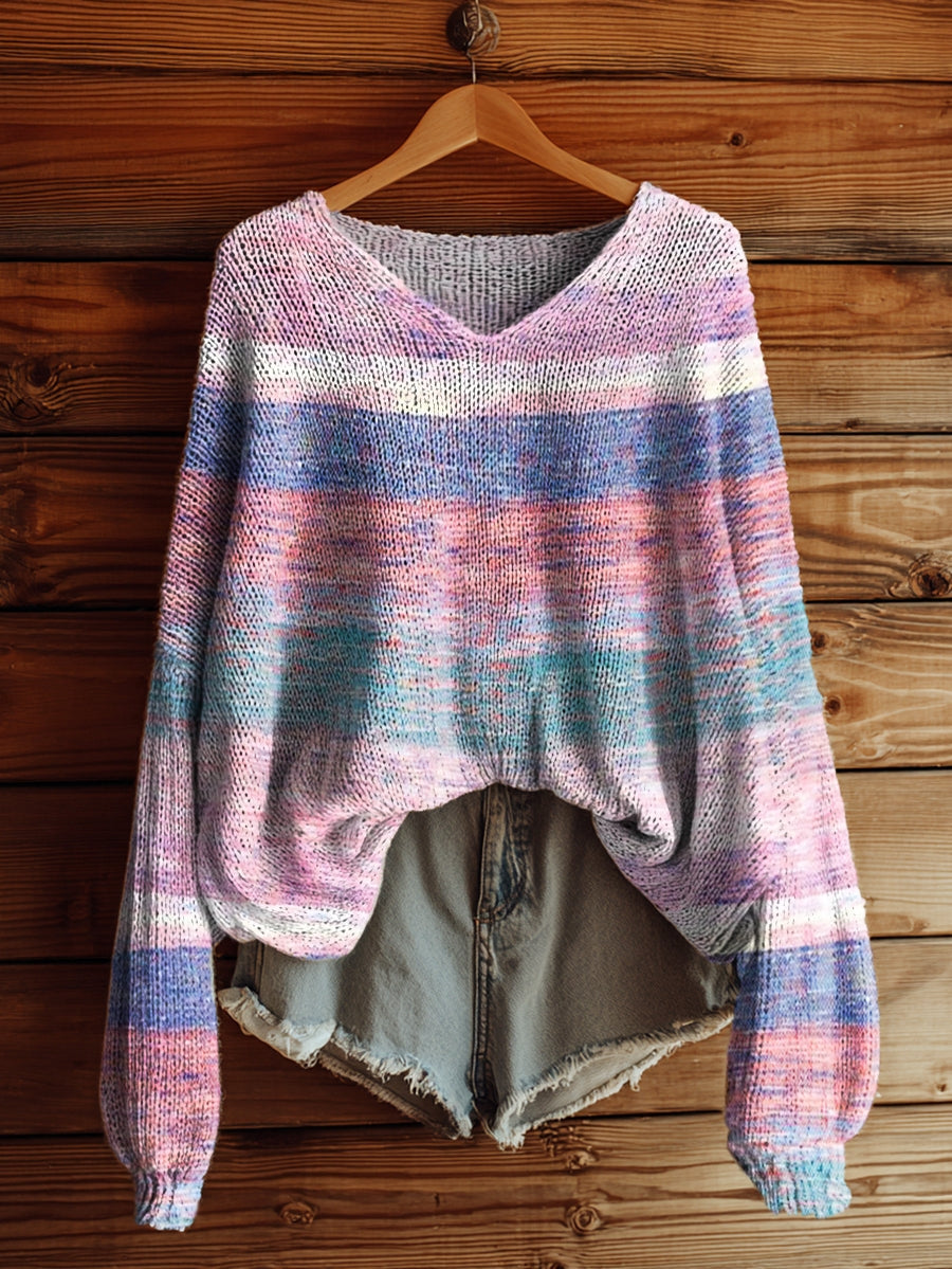 Women's Retro Stripe Print Casual V Neck Pullover Sweater