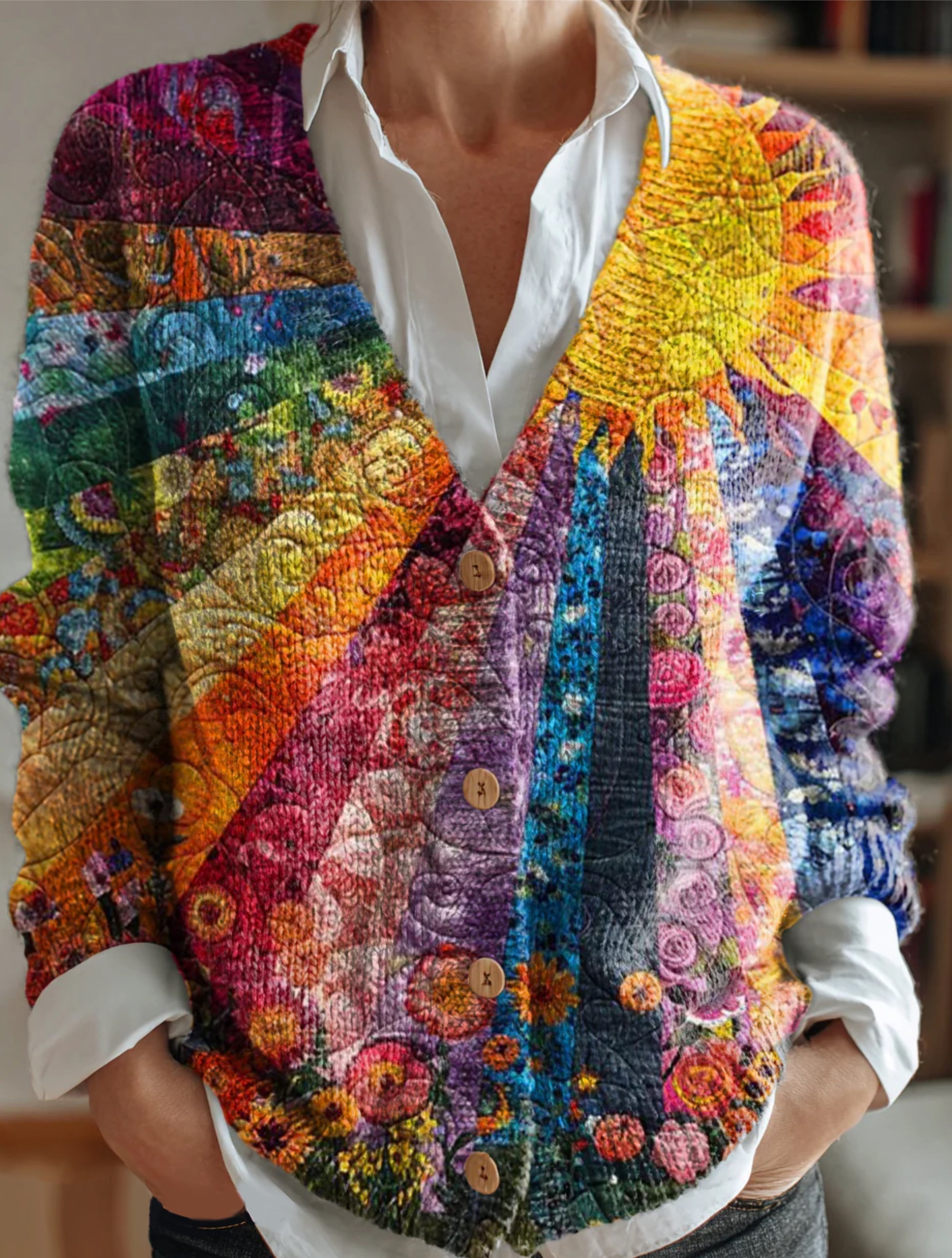 Women's Sun Rainbow Floral Pattern Printed Casual Knitted Long Sleeve Top