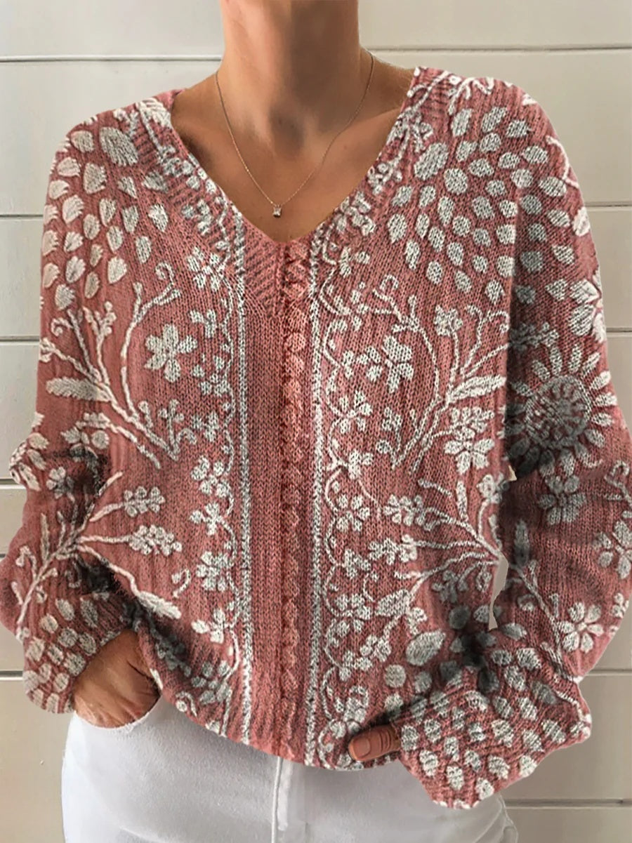 Women's Vintage Ethnic Floral Art Print Casual V-neck Pullover Knit