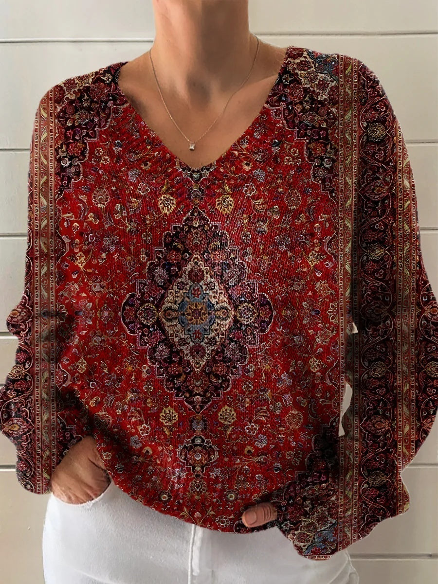 Women's Vintage Ethnic Floral Art Print Casual V-neck Pullover Knit