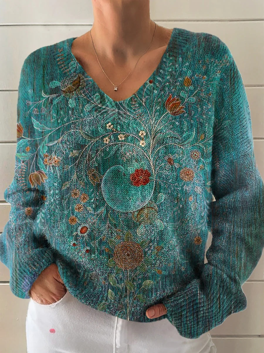 Women's Vintage Ethnic Floral Art Print Casual V-neck Pullover Knit