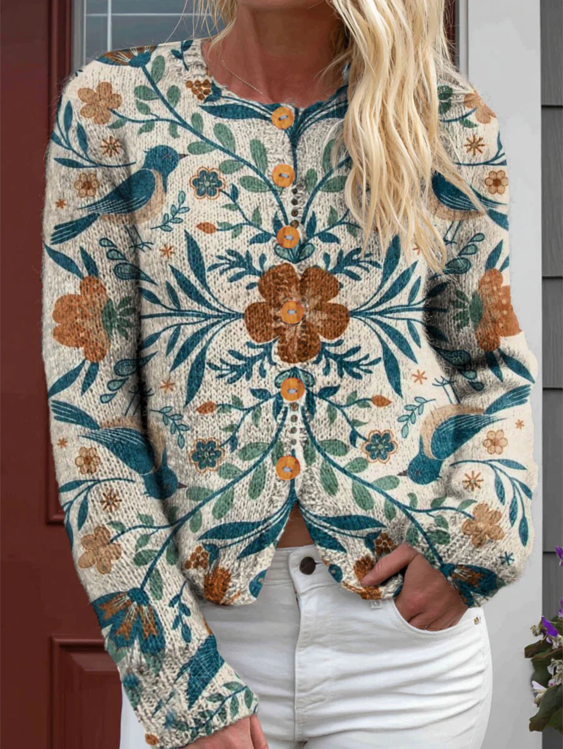 Women's Vintage Ethnicity Flowers Birds Print Buttoned Cardigan Sweater