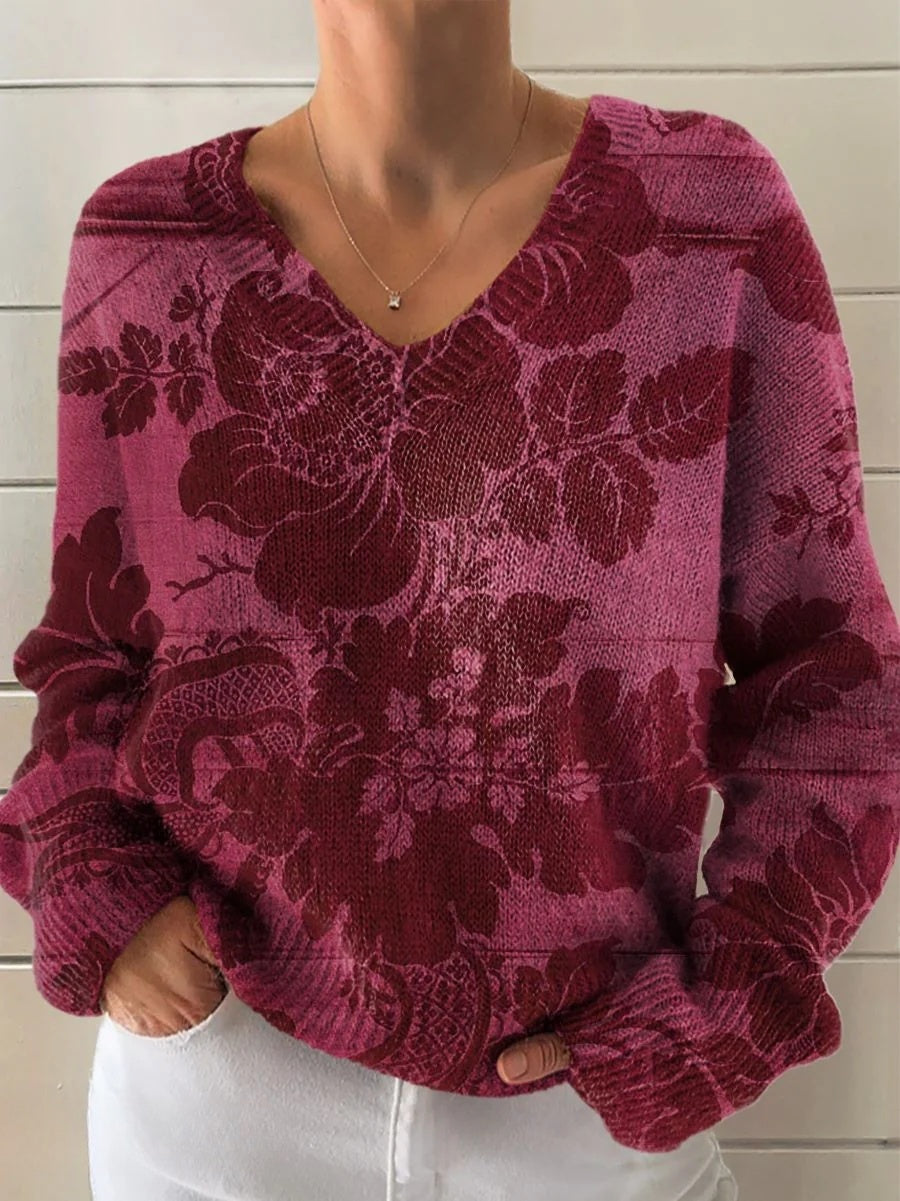Women's Vintage Floral Pattern Artistic Print Casual V-Neck Knitted Sweater