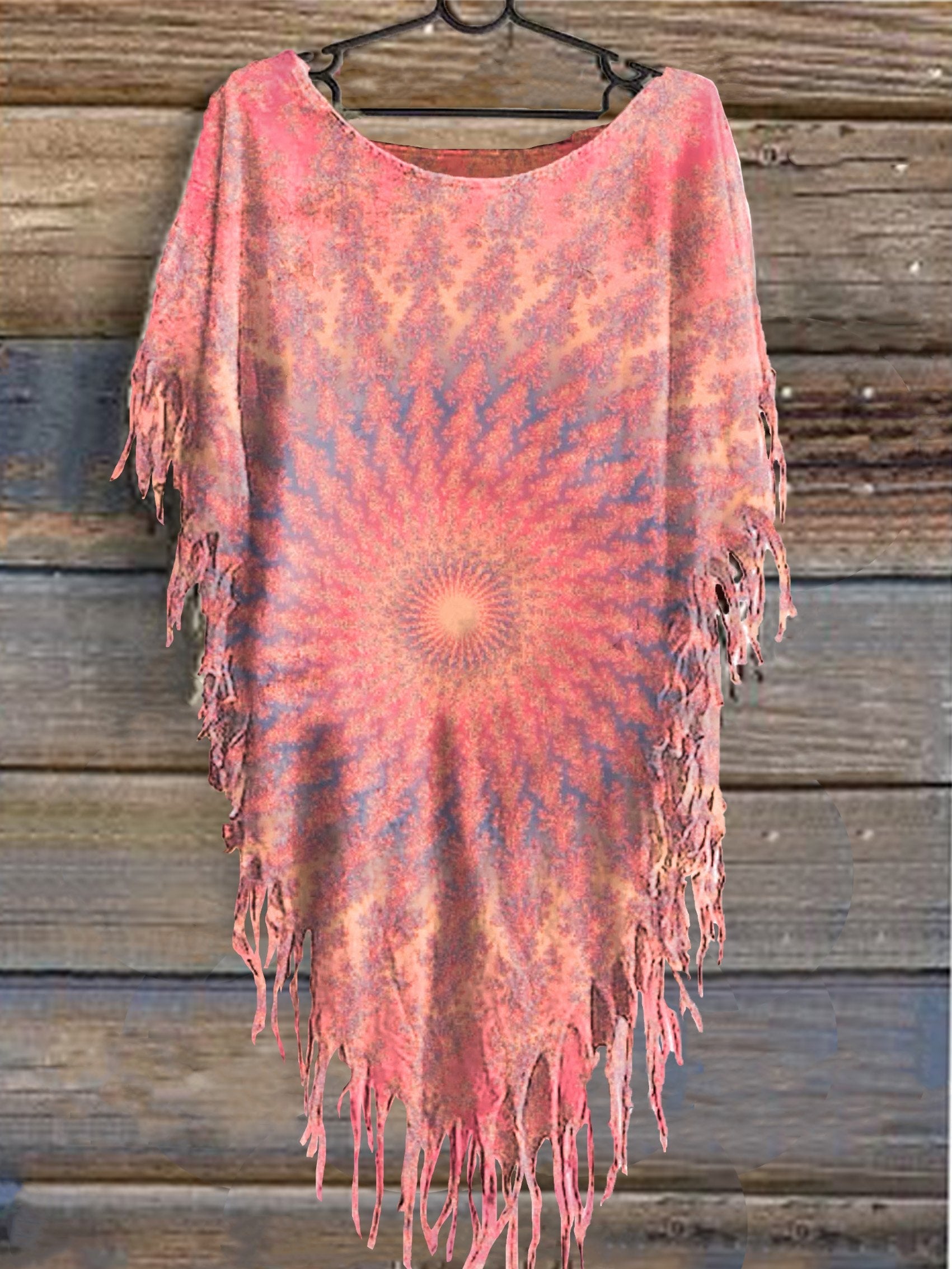 Women's Vintage Tie Dye Print Punk Hippie Batwing Tussle Fringes Poncho Dress